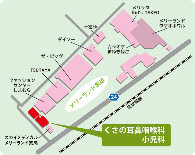 メリーランド武雄という複数の商業施設とアミューズメント施設が融合した敷地内(ファッションセンターしまむら様とスカイメディカル メリーランド薬局様の間)に位置していますので、診療の合間や診療の前後に周囲の施設で買い物などをすませることができます。